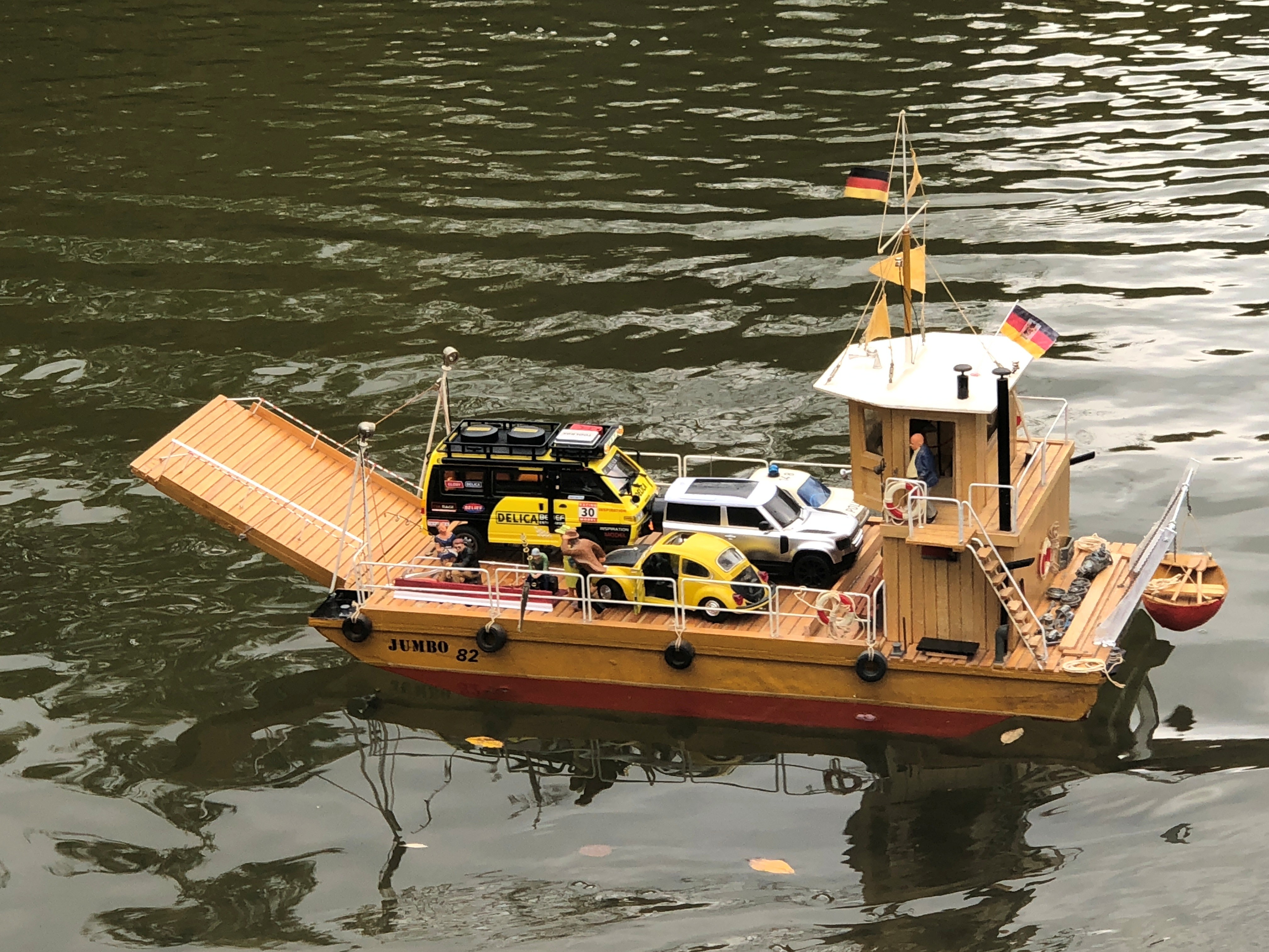 Die „Jumbo 82" ist eine 2-motorige Flussfähre mit Bugstrahlruder, die 1 Landungsbrücke hat und versetzte Landepunkte verbindet. Ein ähnliche Modell habe ich vor vierzig Jahre auf der Elbe gesehen. Die neuen Fähren haben 2 Landungsbrücken. Der Kapitänsstand liegt bei kleinen Fähren am Rand und bei großen Fähren auf einer Brücke.